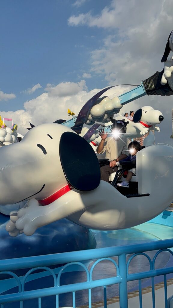 まずはスヌーピーの空飛ぶライドへ。予約乗りしてたからスムーズに乗れて、空から見る景色にめいちゃん大興奮!